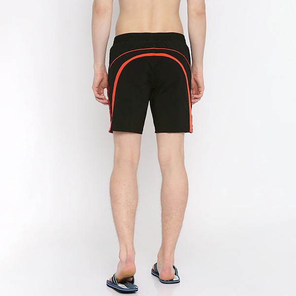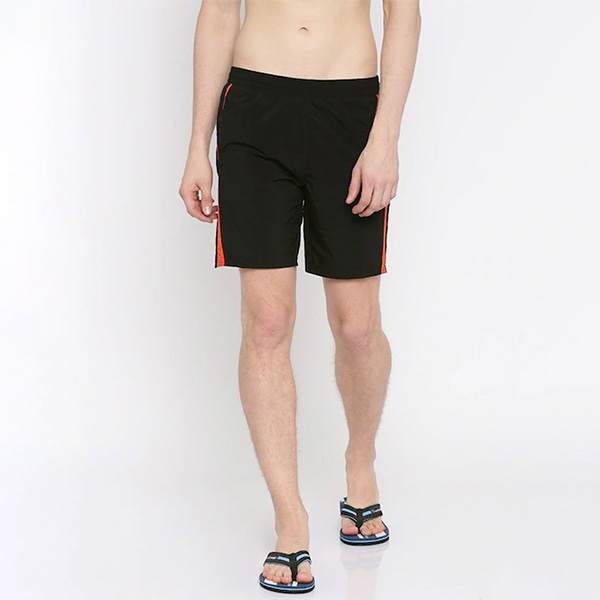 Black knitted mid-rise swim shorts engineered with Endurance+ technology, has an elasticated waistband with inner drawstring fastening, attached lining.